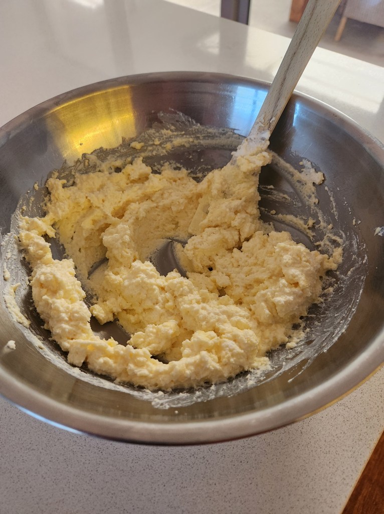 The butter should be softened to make it easier to work with, and the ricotta adds a lovely creaminess to the dough. Mix these together until they form a smooth and creamy base.