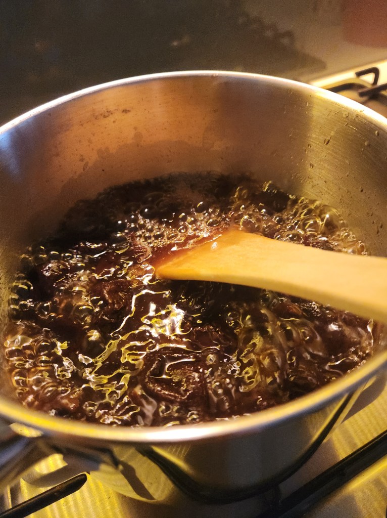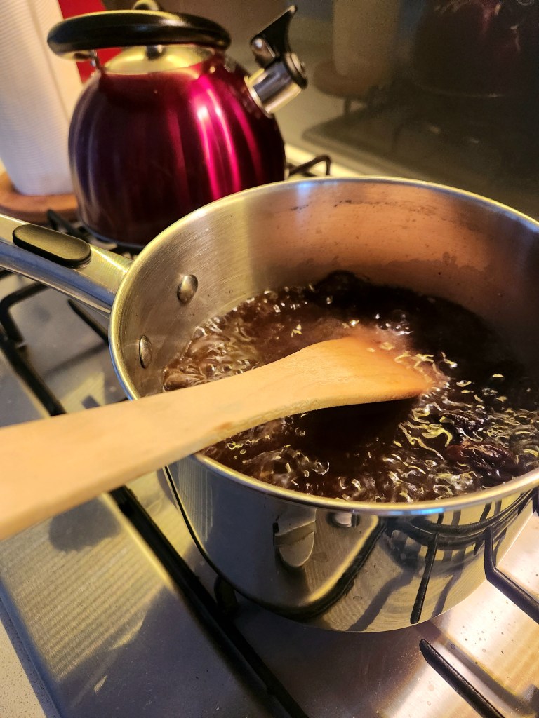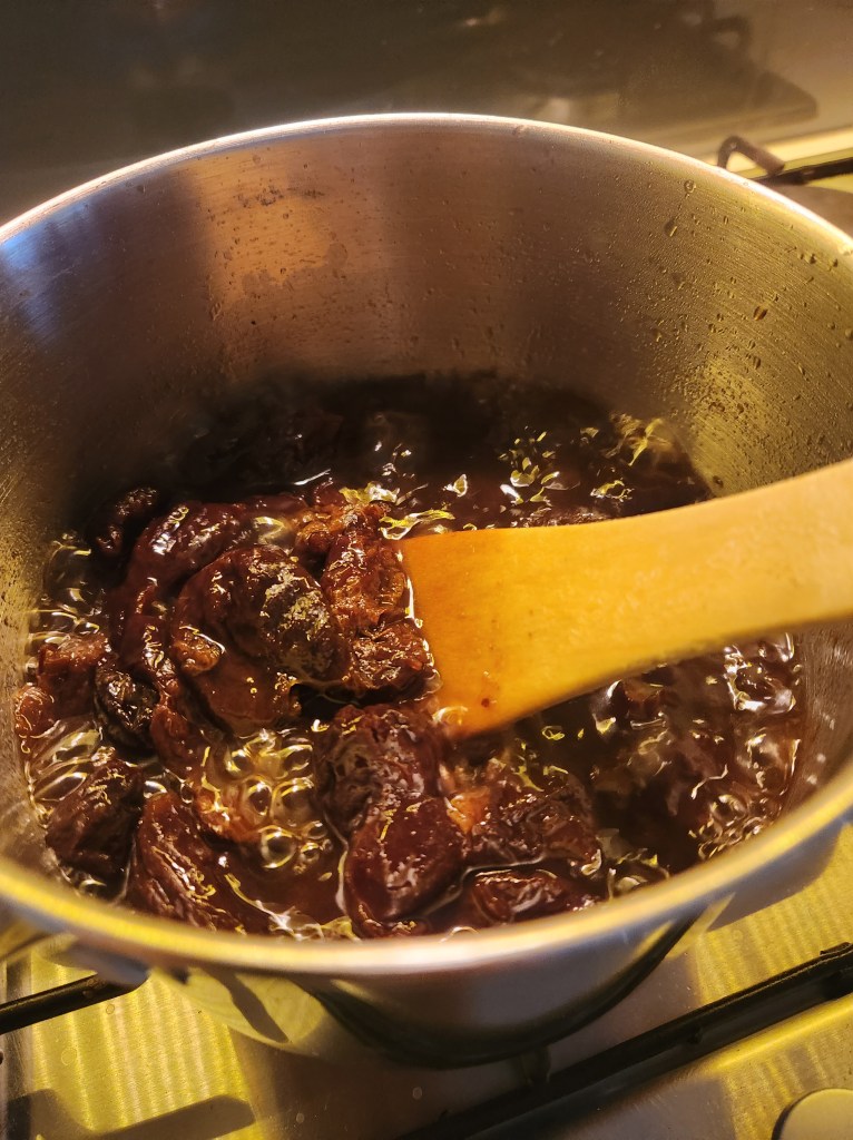 The prunes will begin to soften and break down, blending with the sugar and water to create a thick, fragrant jam.