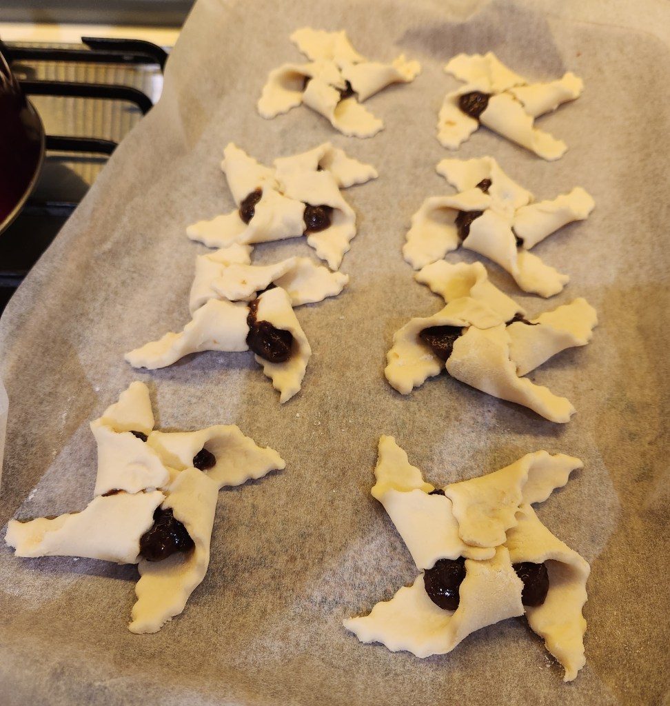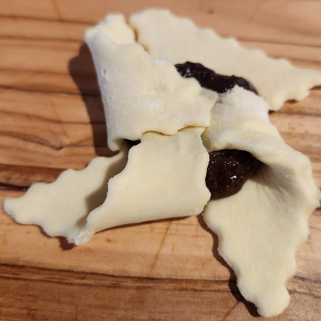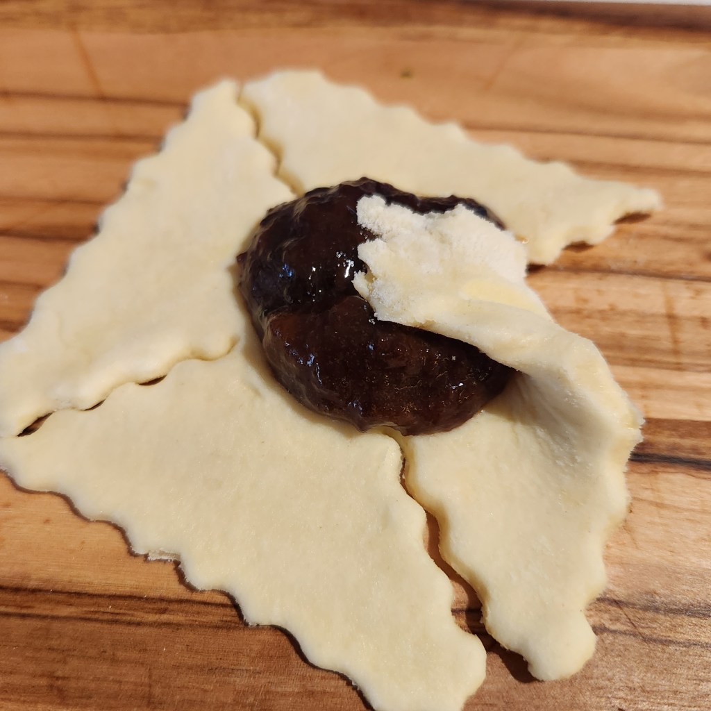 Spoon a teaspoon of the homemade prune jam into the centre of each square, making sure there’s enough room for the corners to fold without overflowing.