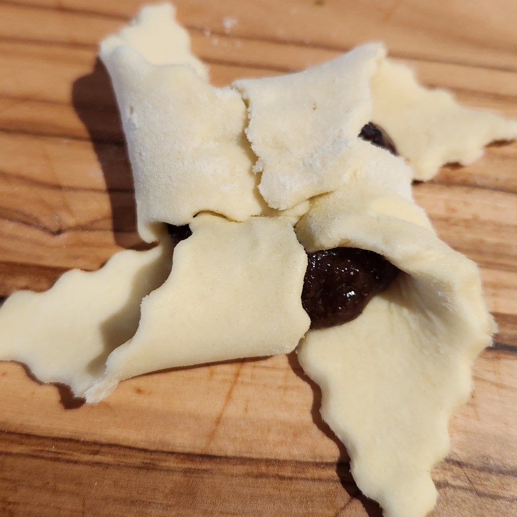 Then, carefully fold each corner of the square over the jam, bringing them toward the centre to form a star shape. Gently press the edges to seal the pastry and keep the jam inside.